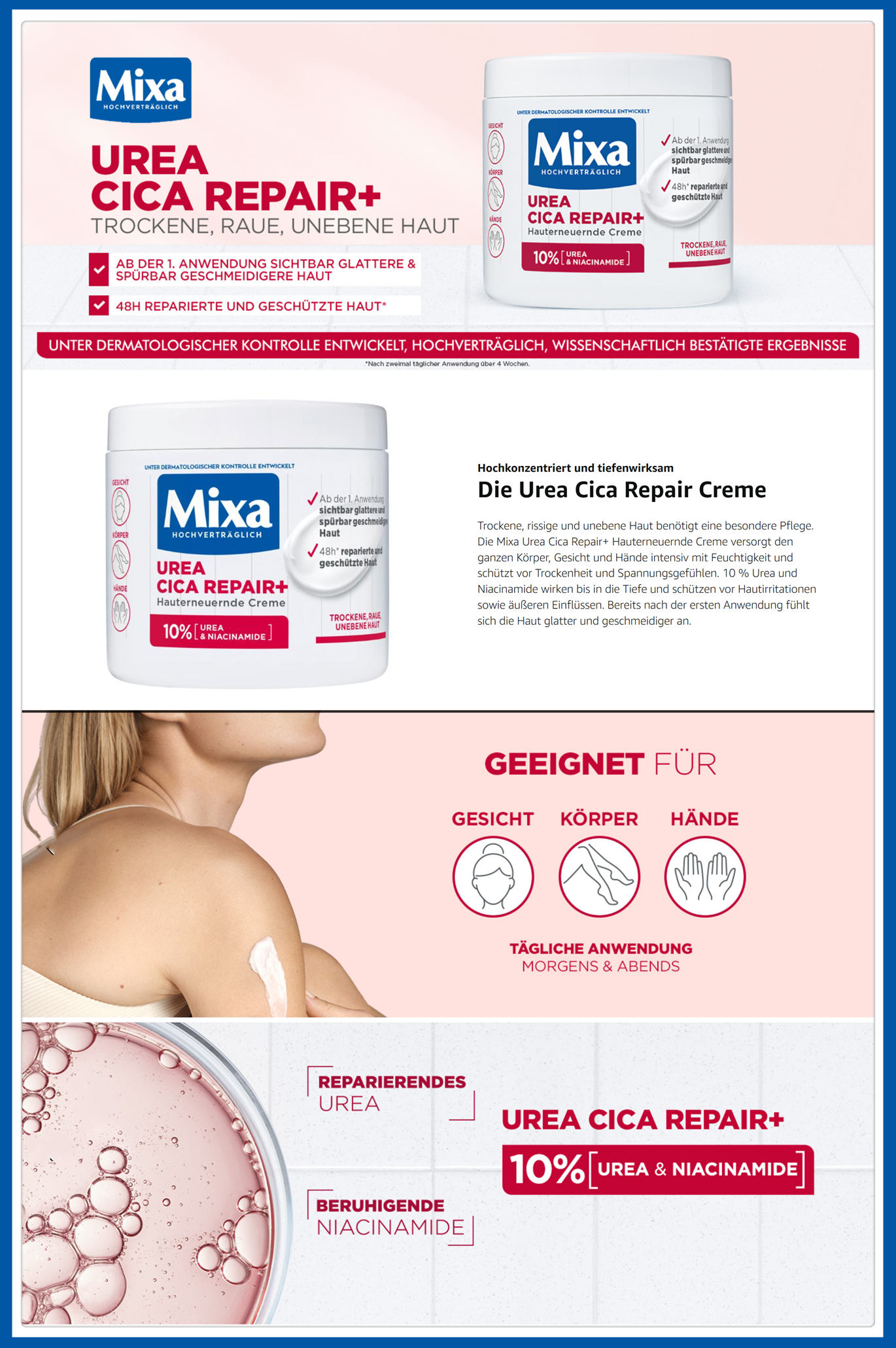 【德国人自己的Cerava!Mixa 尿素CICA修复面霜400ml 亚马逊自营款特价仅6欧!!!】可使干燥脆弱的肌肤恢复活力。这款面霜低过敏性、质地轻盈,能刺激细胞更新,一周内就能减少皮肤粗糙。轻盈低敏配方,刺激细胞更新,减少粗糙;含有尿素和烟酰胺,具有去角质和保湿功效。面霜适用于敏感肌肤,通过皮肤科医生测试。经临床验证,一周即可见效。