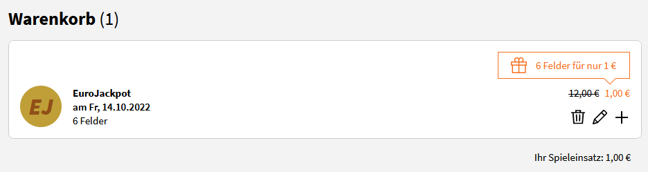 1:点击上面购买直达链接,大家会发现购物车里已经拥有了一注彩票啦!并且金额为1欧!