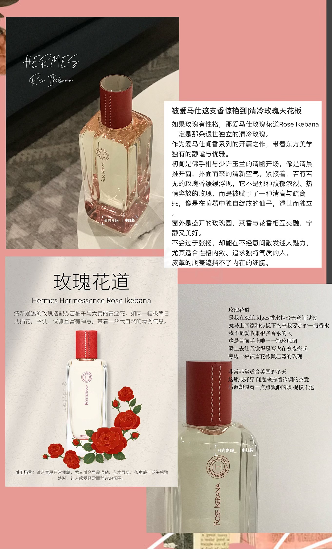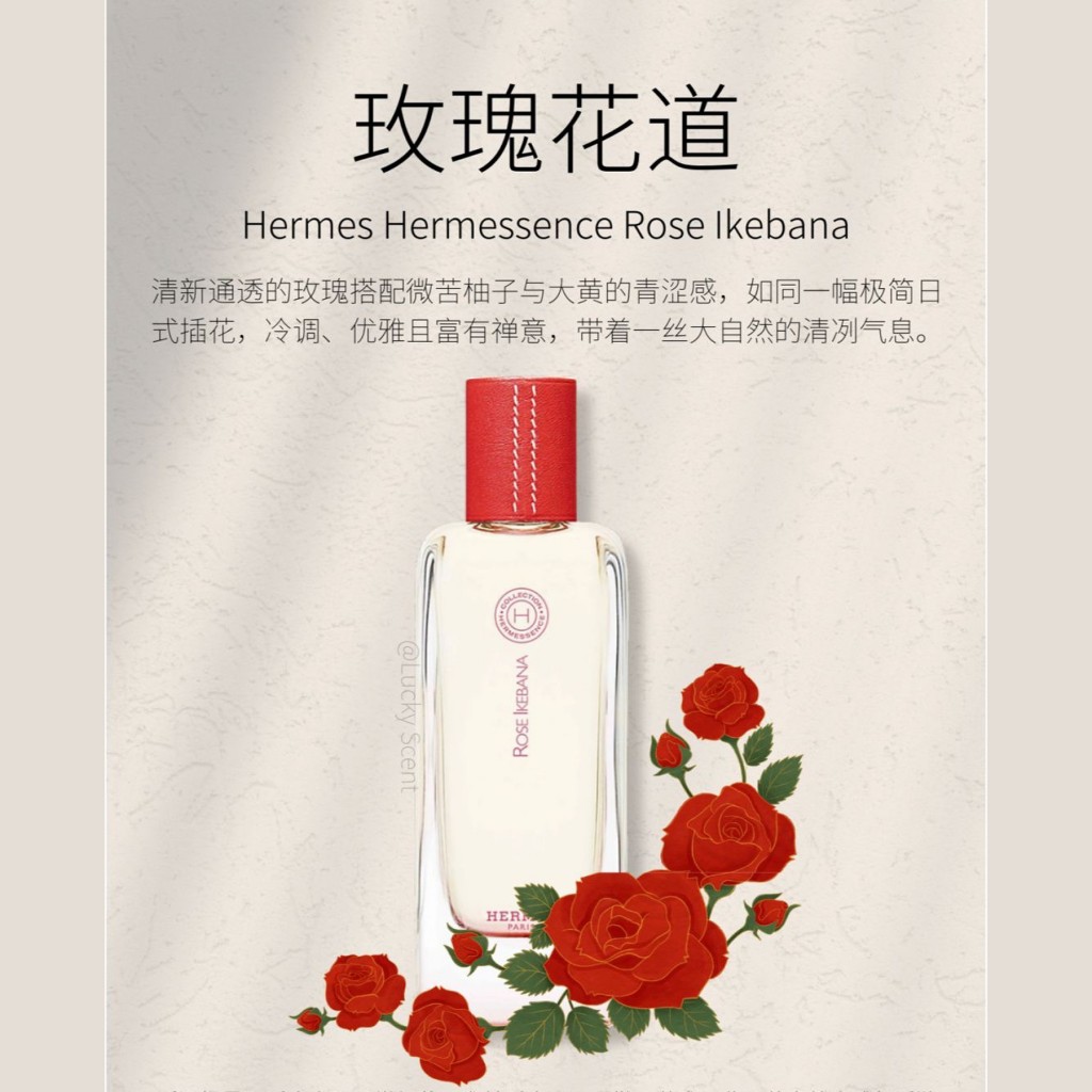 Rose Ikebana 玫瑰花道—🥀2004年 玫瑰花道是Jean-Claude Ellena创造的第一款闻香珍藏系列香氛。调香师的创作灵感源自“花道”,即日本传统花艺,由此衍生出一款轻盈细腻的飘逸玫瑰香。花道(ikebana)的美感与简约,日本的传统花艺运用极简的元素,组合花材与植物来创造,这种表达形式,正好完美地符合我调配香水的创造形式。一朵早晨的玫瑰,点点湿润朝露,细腻又轻盈。像一位在日式庭院中品茶的高智女孩,温柔、克制、不争不抢却自带吸引力。带着葡萄柚的轻盈果香+清新的玫瑰,像是早晨第一缕阳光。很高质感的一支玫瑰,非常容易给初见面的人留下很好的印象🥀