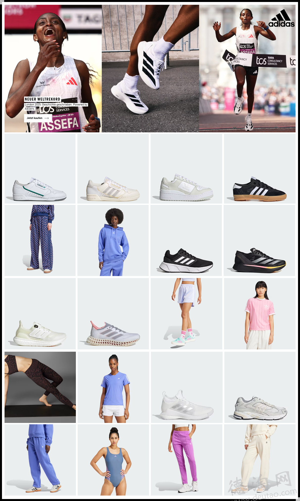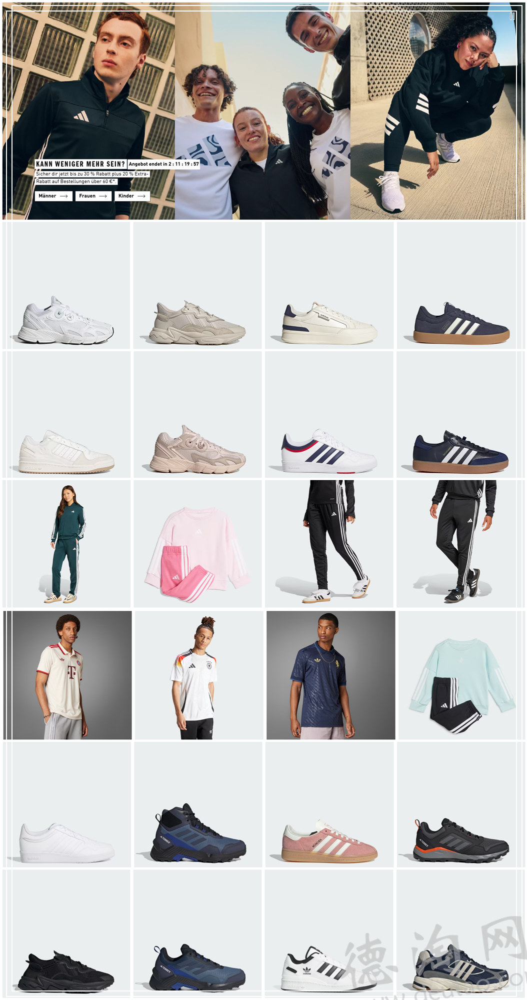 【让运动融入生活!adidas鞋履/服饰 全场低至3折!低配Stan Smith绿尾小白鞋35欧!67折收德迅鞋!】adidas一个经得起时间考验的品牌,在时尚界以不断创新的精神带来备受追捧的单品,时至今日其热度丝毫不减。adidas的品牌标志以“三叶草”的形象被大众所熟知,“三叶草”鞋履与服饰充分体现出品牌对于运动格调与时尚元素的精准把握。其中备受追捧的Stan Smith、NMD等小白鞋与运动鞋造型动感又不失现代气息,而成衣系列标志性的三道条纹服饰也是不可或缺的百搭单品。
