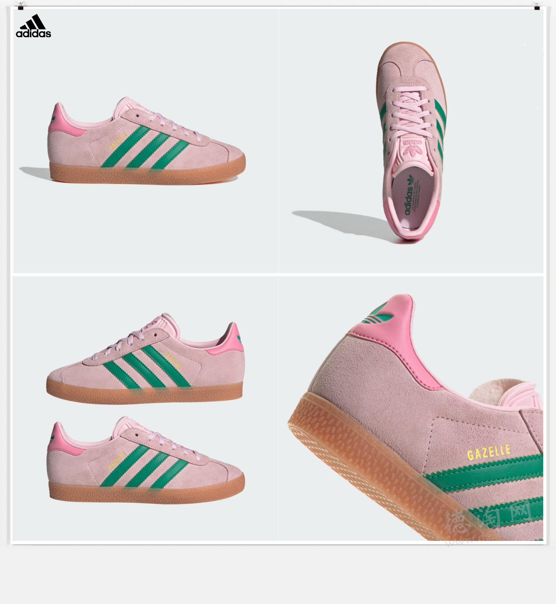 ★ 【Adidas Gazelle粉色大童款 仅75欧!最大码到40码!】Blackpink同款! Adidas Gazelle作为经典不败的运动鞋,自诞生以来便风靡全球时尚圈。其简约而百搭的设计使其成为潮流圈的完美单品。无论是搭配休闲装还是正式服饰,Gazelle都能轻松融入并提升整体造型的品味。半透明的生胶鞋底,露出全皮鞋面,鞋型更修长,并使用三叶草图案鞋底。粉绿的撞色有种啦啦队长既视感!