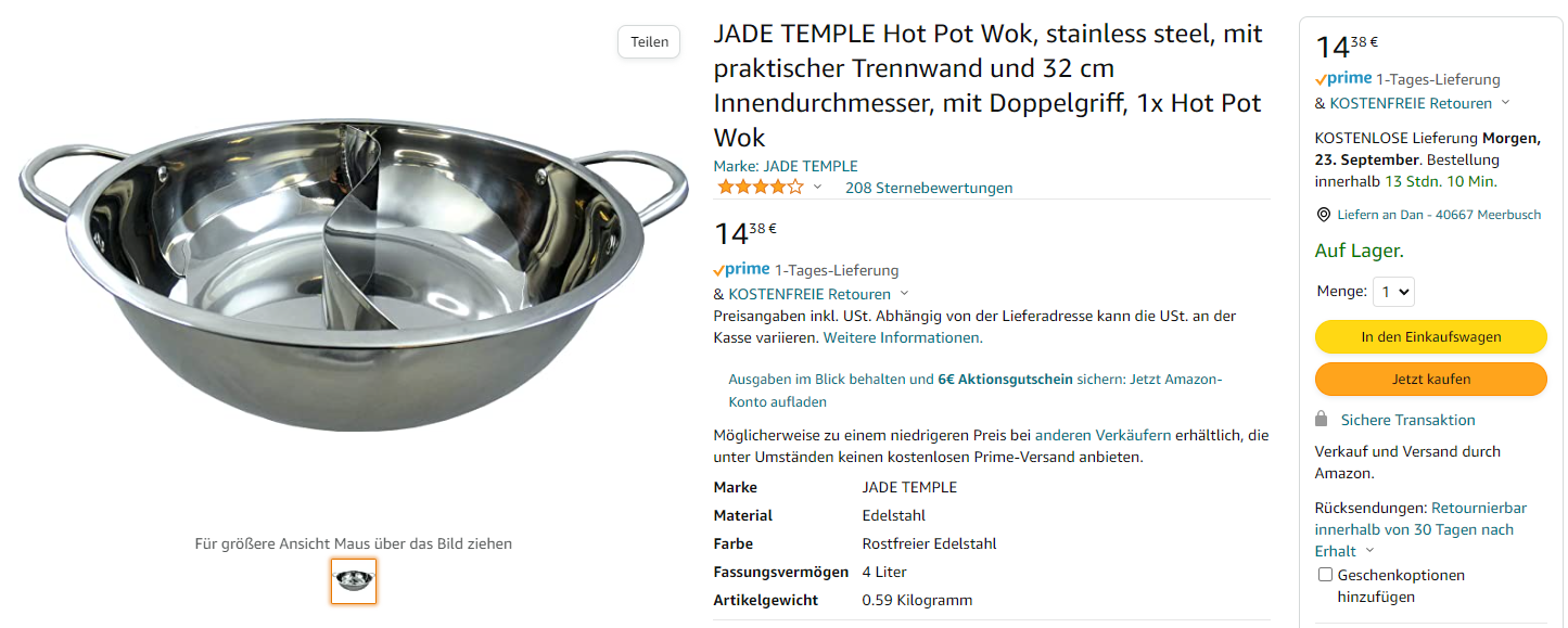 【天冷必须吃火锅啊!不锈钢鸳鸯锅 亚马逊自营款特价仅14欧!今天买,明天就能收到~~~】过年过节邀请你的小伙伴来家里吃一顿火锅怎么样?她喜欢清汤你喜欢麻辣,那么就买个鸳鸯锅一次性解决吧!地道的不锈钢锅,享受原始的亚洲烹饪体验。采用超厚不锈钢制成,轻巧耐用,强度高,不变形,能均匀吸热,可以在电磁炉上使用。抛光做工优良,锅底光滑有光泽,涂层不粘,易清洁。32厘米大直径,人多也不怕啦!