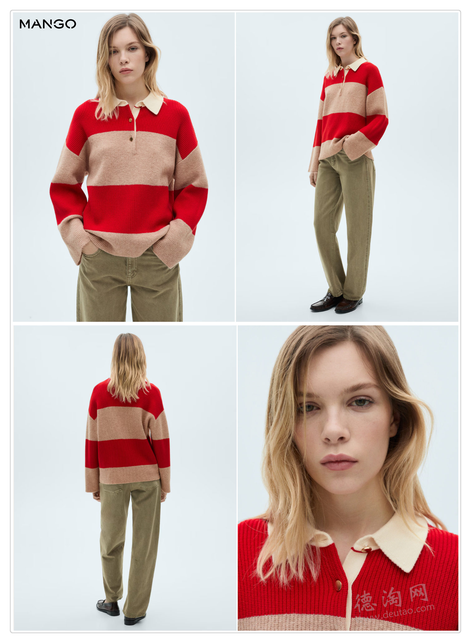 ❤【Mango Polo领针织衫 折后仅29欧!原价45欧!】 略带廓形感的微宽松设计,拥有舒适的藏肉空间。法式Polo领造型,门襟纽扣可自由开合,带来更多造型可能性。红色加米色的宽条纹拼接,是尼斯老城的落日余晖。这个季节作为打底穿在外套下面刚刚好!