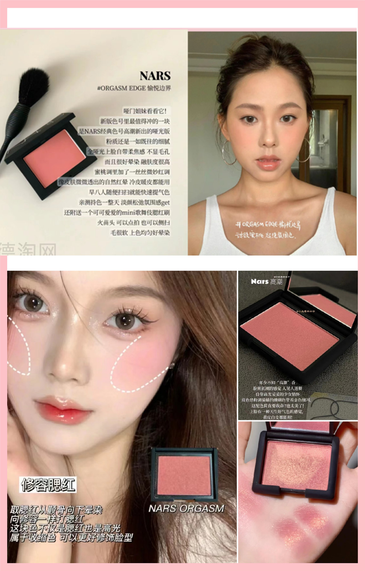 Orgasm是 #NARS 娜斯[品牌]#经典大IP了,名字很欲 妆效很纯火了这么久是有原因滴👍🏻🌟质地丝滑细腻,软软糯糯的膏体,带微微细闪,阳光下很美,很自然冷艳的颜色,涂在脸上不会一下子就很明显,很适合新手,可以少量多次,也可以随时随地补妆,颜色均匀自然,膏修补了粉状容易显毛孔的Bug,颜色更暖适合黄皮,用过高潮腮红觉得显毛孔的可以入这个膏。粉状腮红最有特点是金色偏光,让腮红自带高光,喜欢自然挂高光效果的,这支完全可以一举两得!