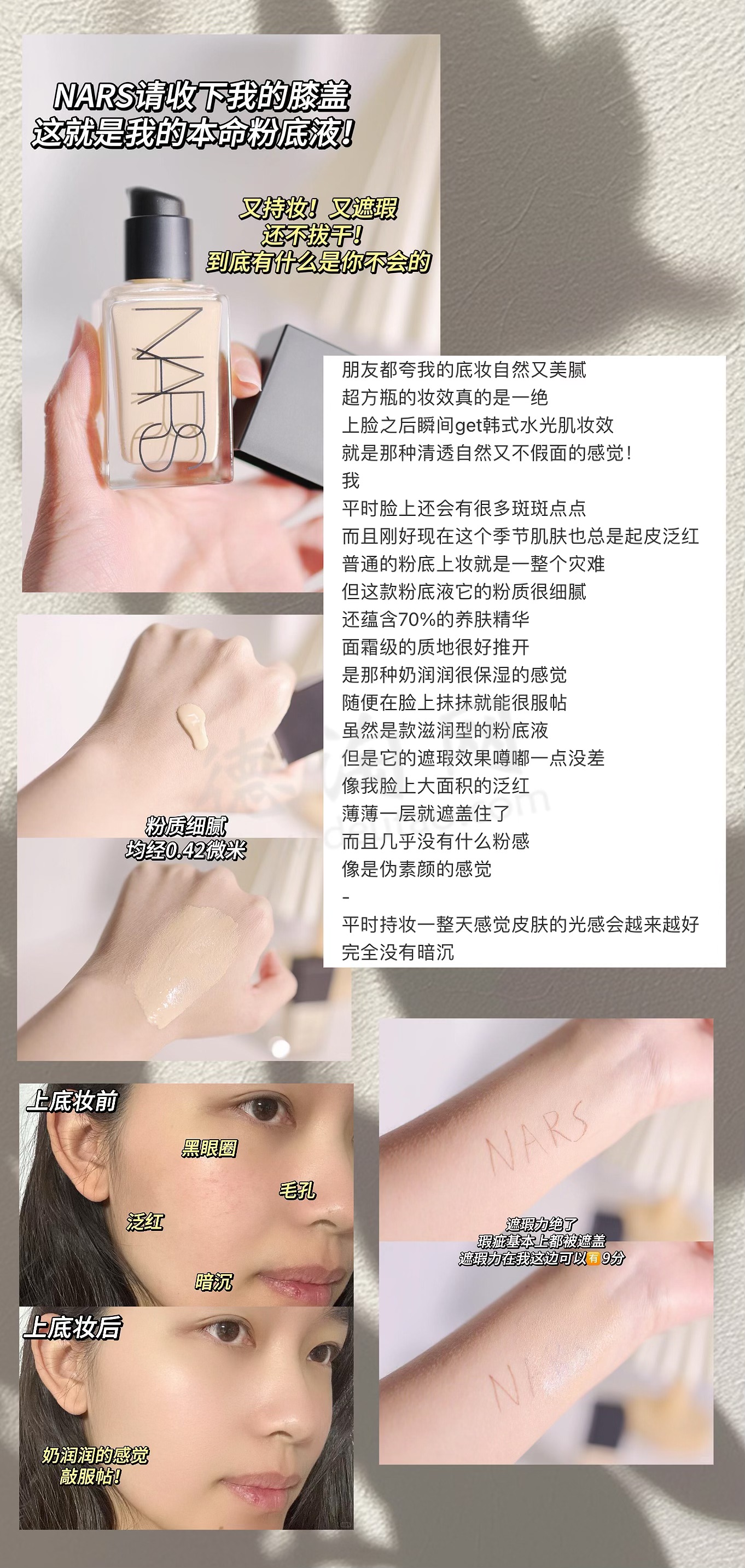 【NARS 超方瓶/原生光亮肌粉底液 官网直接5折仅28欧!!!🎁价值41欧的正装妆前乳!】 能依据光线的变化,使粉体动态调整至最适当的色调,听上去已经让人超级心动!不但能轻易平滑肌肤,遮盖痘印、红印及均匀肤色,而且质地水润易推、延展性极高,小编把粉底擦上面后,发现粉底真的非常贴肤!薄薄一层就能把面上绝大部分的瑕疵都修饰掉,再针对需要重点遮瑕的地方叠加粉底液,轻松就能打造清透明亮、自然立体的妆容。为肌肤赋予自然光泽,缔造就像女星一样充满透明感、天生自带滤镜的美肌!