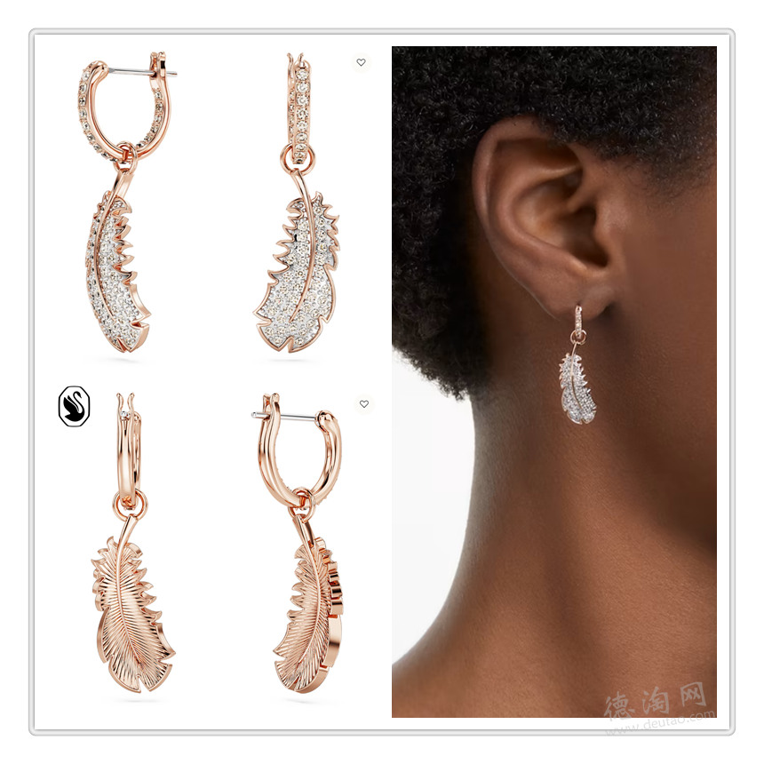 ★【Swarovski Idyllia羽毛耳环 折上折仅61欧!原价129欧!】 这对耳环以羽毛为灵感,其华丽色彩和自然形状将为您的风格平添轻盈典雅。两根美丽的羽毛悬于耳下,微光闪烁的密镶饰石和施华洛世奇水晶交相辉映,美不胜收。一份自然灵动的礼物,犒劳自己或送给挚爱皆宜。