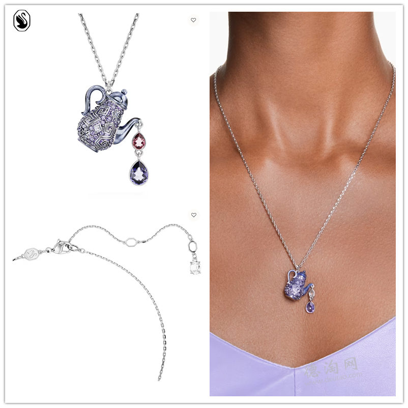 ★【Swarovski 爱丽丝梦游仙境联名茶壶项链 折上折仅83欧!原价149欧!】 绝美梦幻紫!这款项链灵感来自疯帽子的下午茶派对,吊坠是一只紫色闪耀的小茶壶,还滴落着两颗水晶小水滴,仿佛童话在颈间流转。细节做得很精致,延长链尾部还有小锆石点缀。长度是42–49cm,粗脖子女孩也能轻松驾驭!